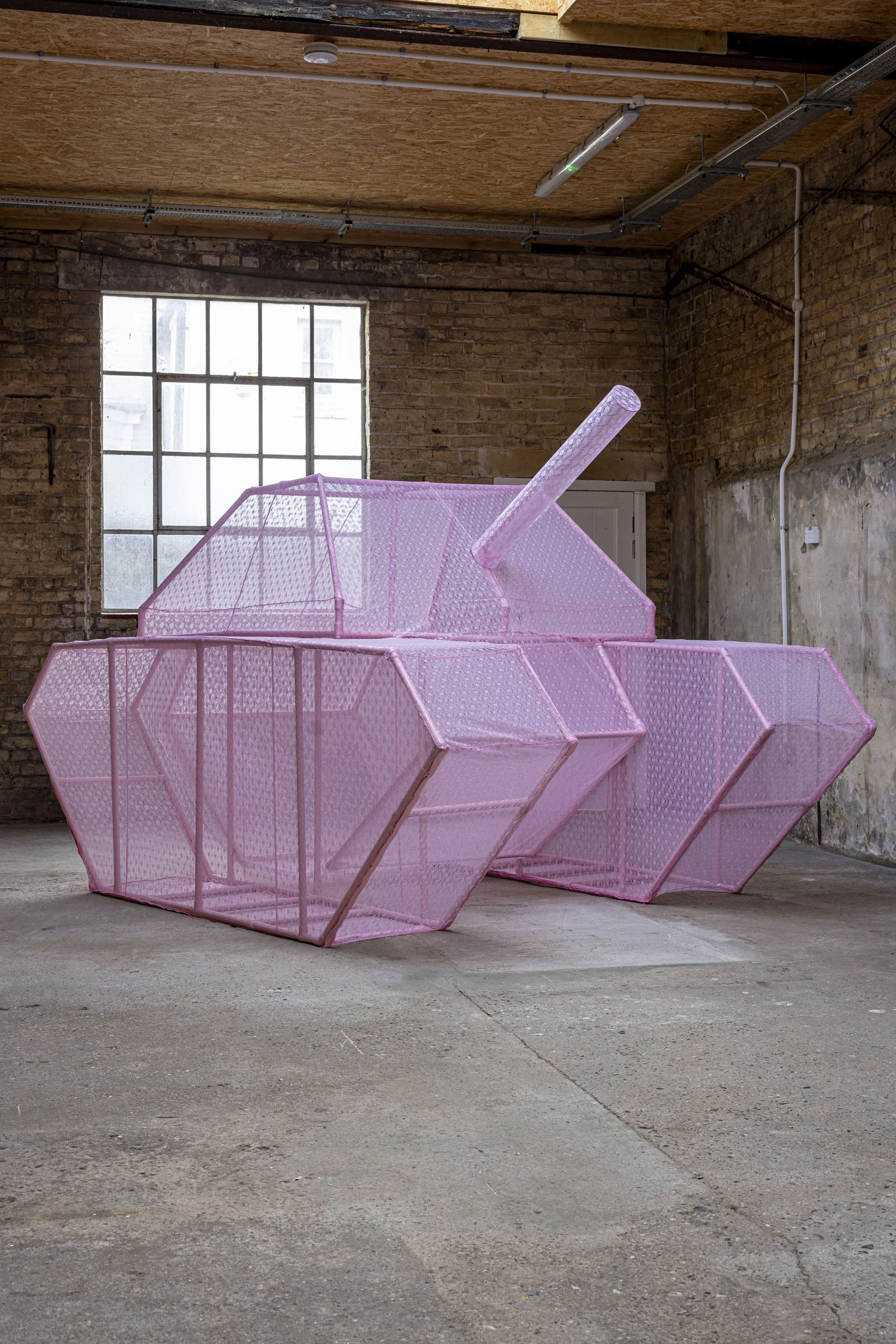 Although her career moved outside the traditional art world for many years, making remained a constant alongside her professional work. Returning more fully to sculpture later in life, Parker now develops large-scale installations that explore systems of tension, containment, and spectacle through the collision of industrial forms and feminine-coded materials.